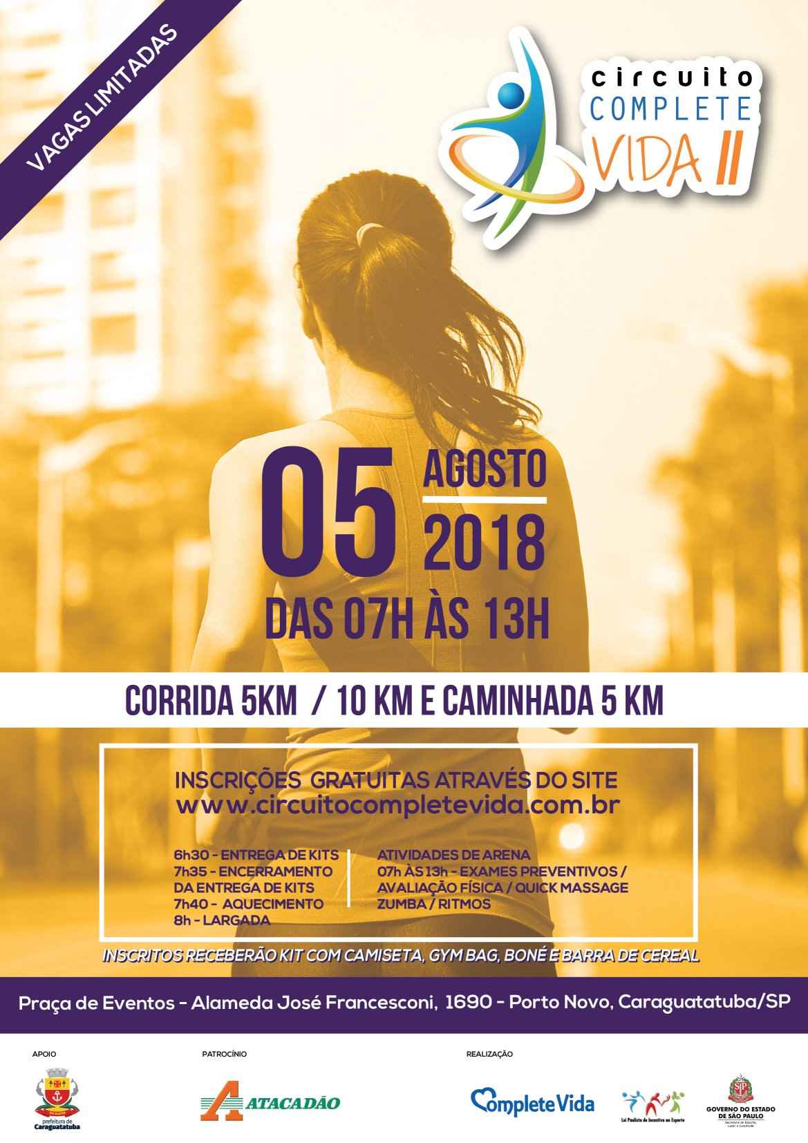 Caraguatatuba recebe, no primeiro domingo de agosto (05/08), o Circuito Complete Vida II. O evento reunirá competições, atividades físicas, exames preventivos e atividades recreativas que buscam incentivar a prática de atividades físicas e a adoção de hábitos saudáveis para a população.