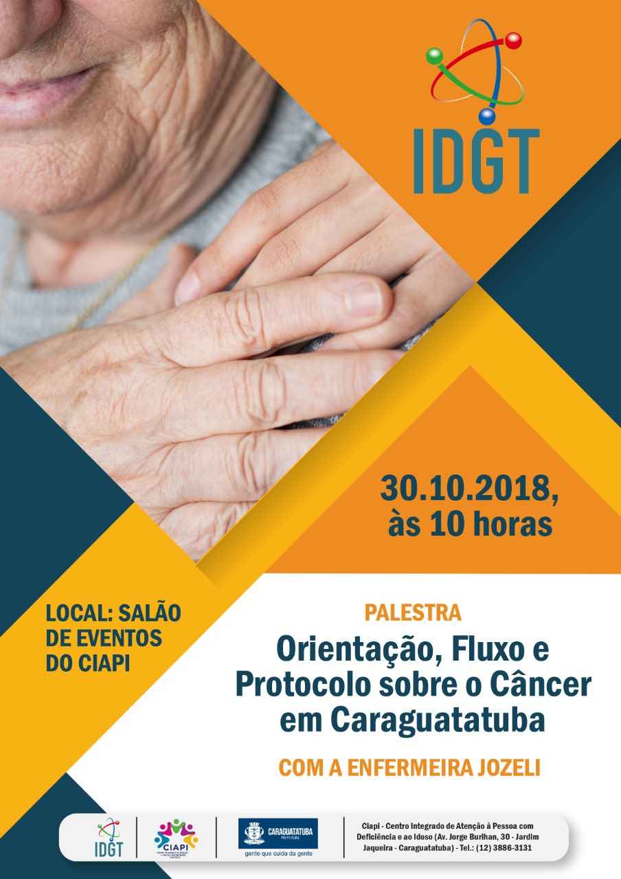 O Centro Integrado de Atenção à Pessoa com Deficiência e ao Idoso (Ciapi) promove nesta terça-feira (30/10), às 10h, palestra sobre Orientação, Fluxo e Protocolo sobre o Câncer em Caraguatatuba. A atividade é gratuita e aberta ao público.