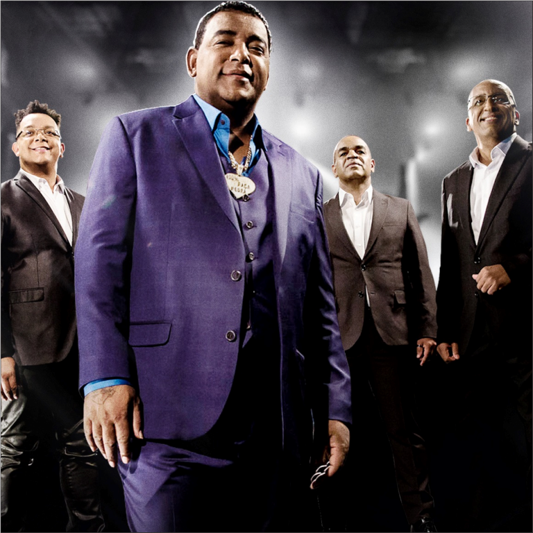 #PraCegoVer: Foto oficial do grupo Raça Negra com o vocalista de terno roxo logo a frente.