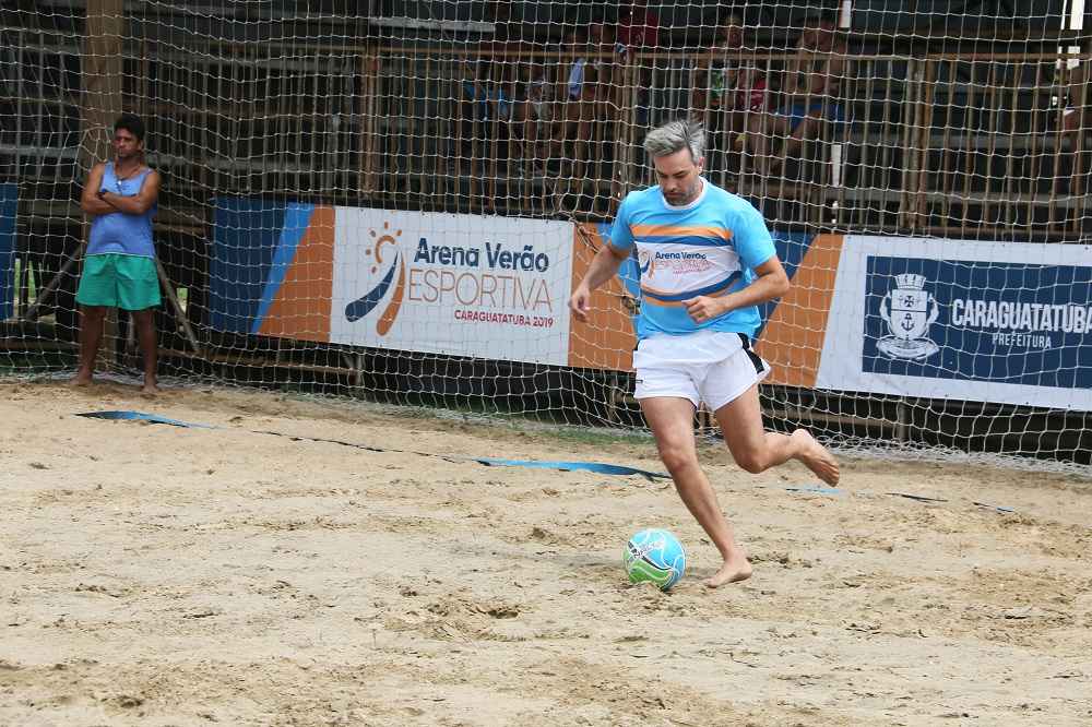 #PraCegoVer: Ator Márcio Kieling corre e chuta bola durante partida de futebol de areia. (Foto: Luis Gava/PMC)