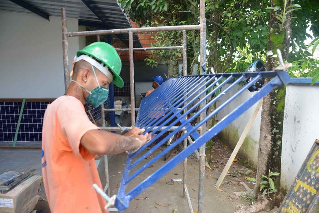 #PraCegoVer: Funcionário utilizando equipamentos de segurança lixa uma grade em obra na UBS do Jaraguazinho (Foto: Cláudio Gomes/PMC)