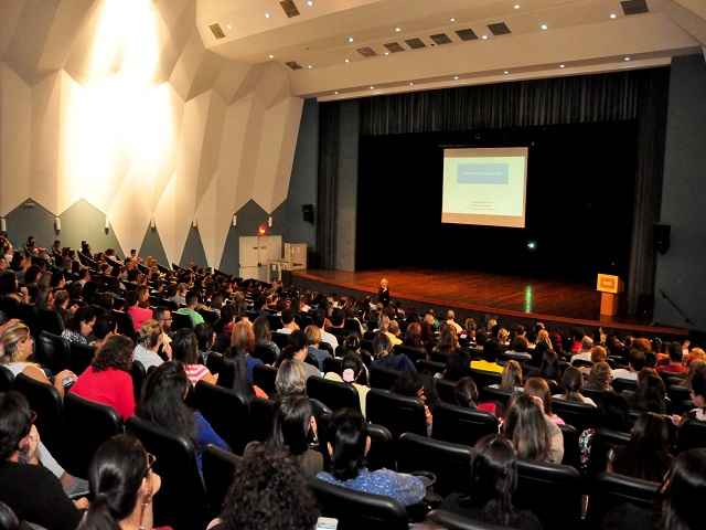 #PraCegoVer: Segurados do CaraguaPrev durante treinamento sobre “Difusão da Cultura Previdenciária” em 2017, no Teatro Mario Covas, com a especialista em Direito do Estado pela USP (Universidade de São Paulo) Magadar Briguet (foto: Luis Gava/PMC)