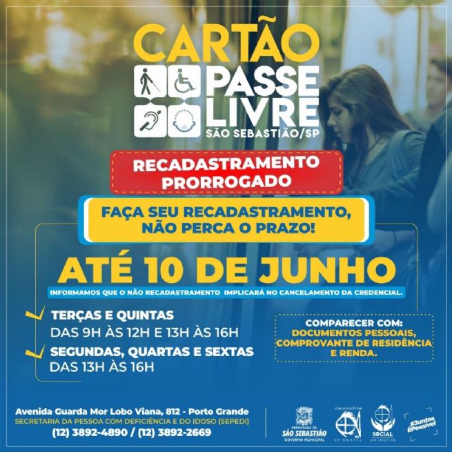 A Prefeitura de São Sebastião, por meio da Secretaria de Pessoa com Deficiência e do Idoso (SEPEDI), prorrogou o prazo do recadastramento do Passe Livre para Pessoas Com Deficiência (PcD) até o dia 10 de junho.