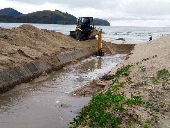 Com índices pluviométricos acima de 100 mm em menos de 24 horas e com o volume de chuvas coincidindo com uma maré acima de 1 metro de altura, a cidade de Caraguatatuba, durante a tarde de quinta-feira (04/07), mobilizou integrantes da Defesa Civil e da Secretaria de Serviços Públicos (Sesep) para desassoreamento de canais de drenagem que desembocam na praia, na região central da cidade.