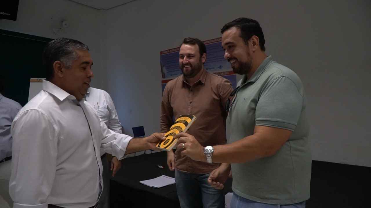 #PraCegoVer Garcez recebe livro da mãos do secretário de Comunicação, Rodrigo Tavano, na presença do gerente regional do Sebrae/SP, Jardel José Busarello(Fotos: Audísio Santana/AVP Divulgação/PMC).
