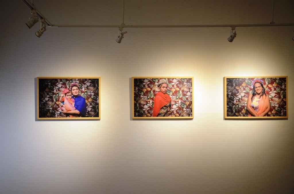 #PraCegoVer: Três quadros, com imagens de várias Fridas em cenários com fundos coloridos em vermelho e flores, estão expostos em uma parede iluminada por refletores (Foto: Divulgação/PMC)