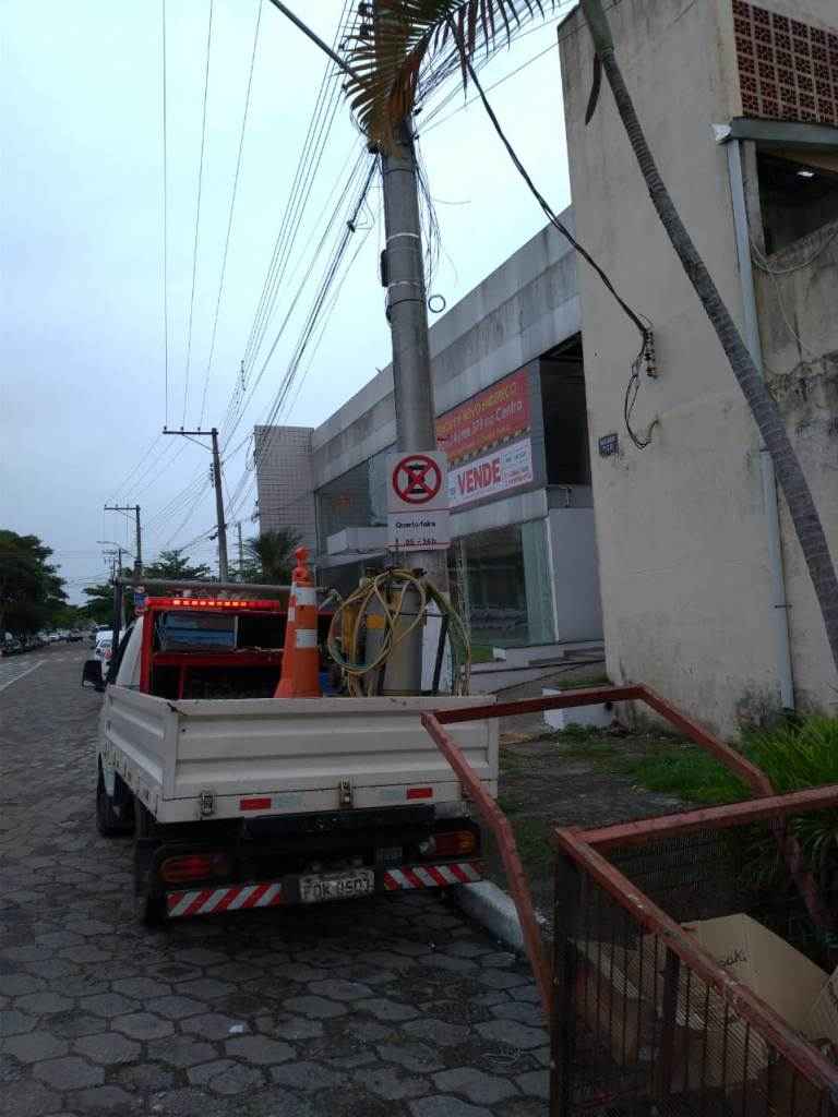 #PraCegoVer: Caminhão da Secretaria de Mobilidade Urbana está encostado ao lado de um poste onde foi feita a instalação de uma placa (Foto: Divulgação/PMC)