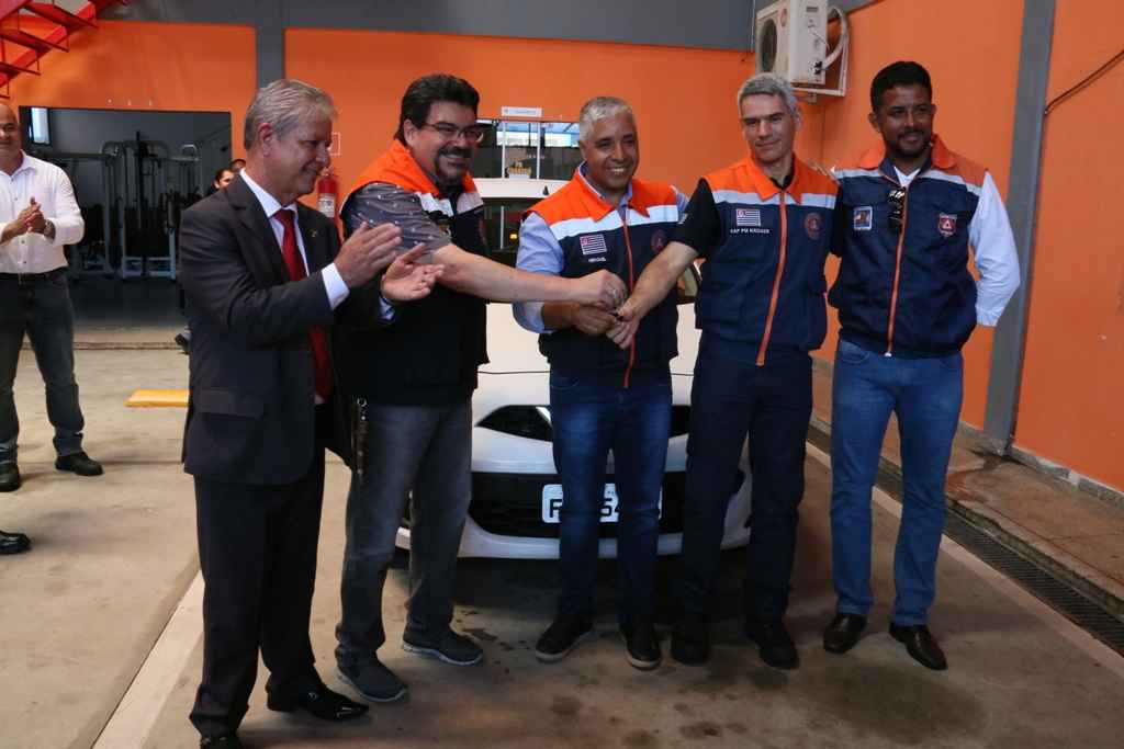 #PraCegoVer: Representantes da Defesa Civil e da Câmara pegam chave da viatura que será usada pela equipe (Foto: Divulgação/PMC)
