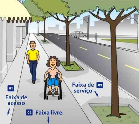#PraCegoVer: ilustração – calçada com os três tipos de faixas, na faixa livre, um homem caminhando e uma pessoa em cadeira de rodas; na faixa do lado direito, de serviço, árvores ocupam o espaço, sem interferir o trajeto; e na faixa da esquerda, de acesso, lojas ocupam o espaço; (Foto: arte/PMC)