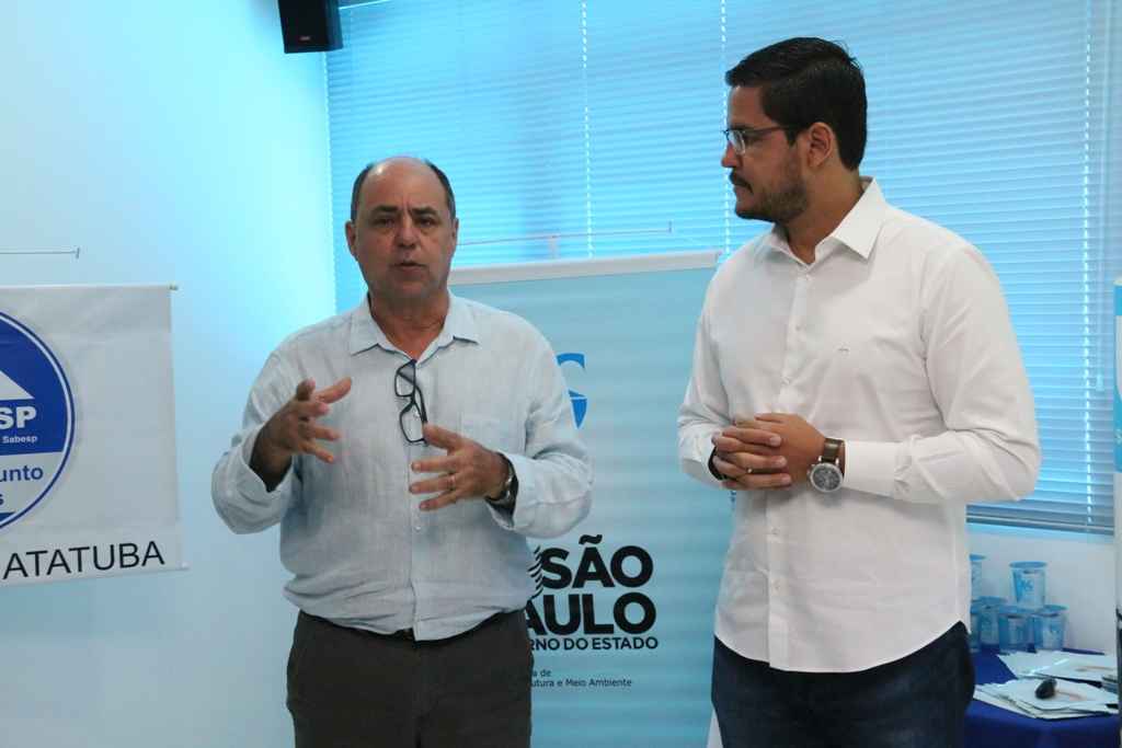 #PraCegoVer: Prefeito Aguilar Junior e superintendente da Sabesp, Ruy Bueno estão em pé e ao fundo dois banners (Foto: Divulgação/PMC)