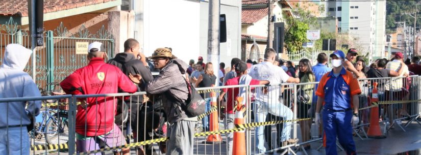 As equipes da Secretaria de Mobilidade Urbana e Proteção ao Cidadão colocaram gradis e cones na rua da agência e entorno para organizar o posicionamento das pessoas que vão em busca do auxílio emergencial e outros benefícios.