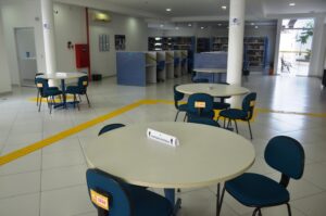 #PraCegoVer: Na imagem, capturada no saguão da Biblioteca Municipal Afonso Schmidt, observa-se espaço com mesas e cadeiras, computadores e, ao fundo, prateleiras com livros.