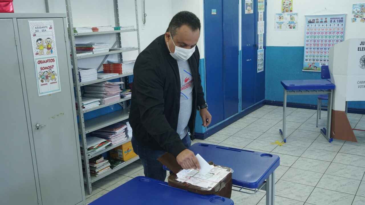#PraCegoVer: Homem de camisa branca e casaco preto está dentro de uma sala de aula, com estante cheia de livros ao fundo, ele coloca papel dentro da urna, que está colocada entre duas carteiras azuis (Foto: Arquivo/PMC)