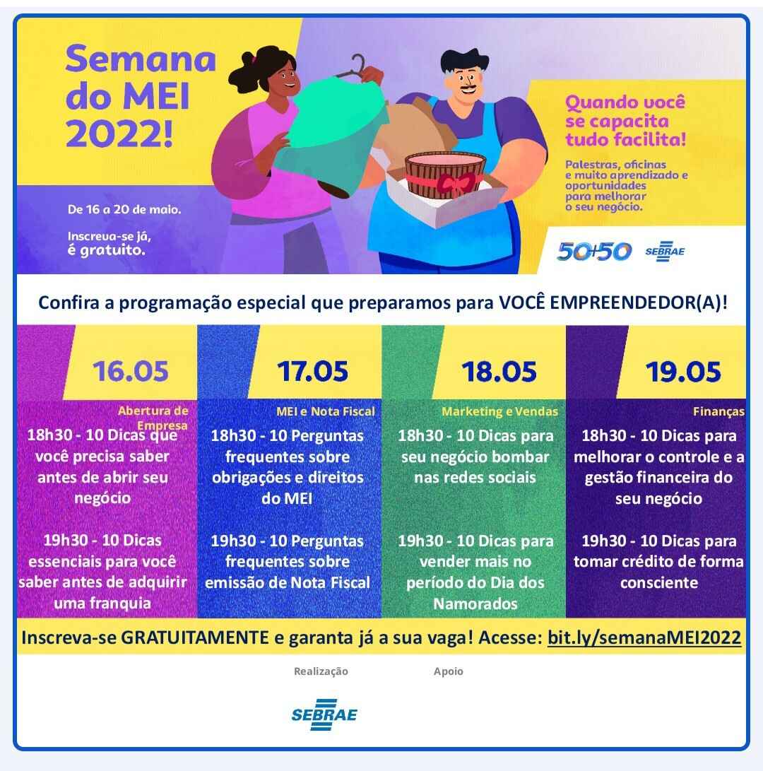 As inscrições são gratuitas e podem ser feitas pelo site do Sebrae no link. Após a confirmação de cadastro por e-mail, selecione o evento ‘Semana do MEI’ que deseja, pode se cadastrar em mais de um, e a plataforma estará livre para acessar as programações nos dias e horários selecionados.