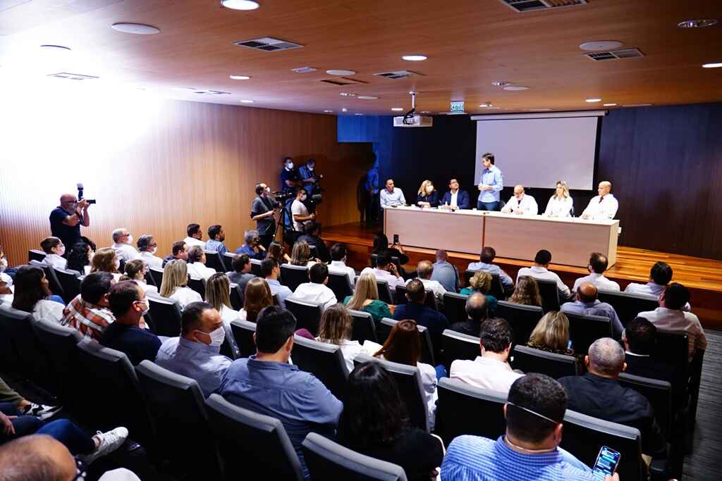 #PraTodosVerem: Equipe médica e alunos do curso de medicina da Unitau Caraguá acompanham fala do governador Rodrigo Garcia no auditório do Hospital Regional (Foto: Cláudio Gomes/PMC)