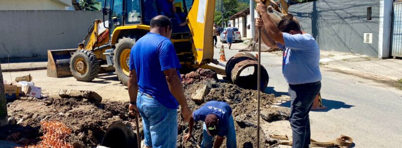 Estão sendo instalados um total de 50 metros de tubulação nova de 60 centímetros de diâmetro, em substituição a antiga tubulação antiga, que era de 40 centímetros e totalmente assoreada.