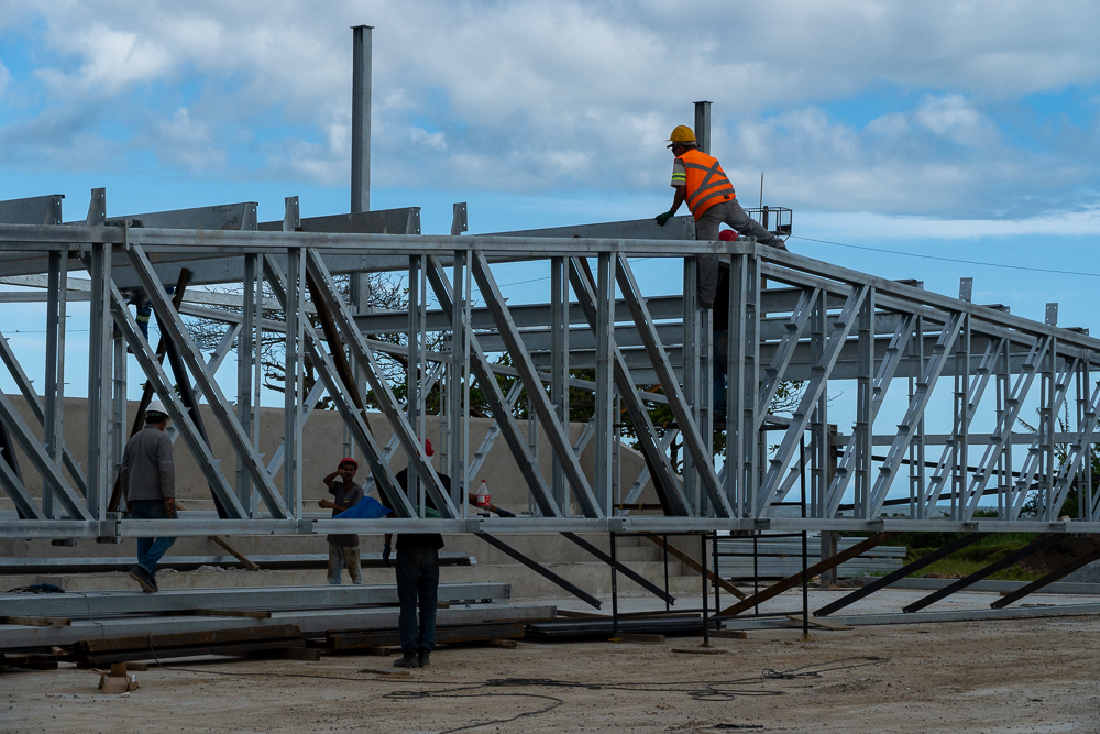 Nesta semana, estão sendo realizados os serviços de pintura, colocação de grama sintética, instalação de alambrados, montagem da estrutura metálica para a cobertura da quadra e aplicação de massa nos vestiários.