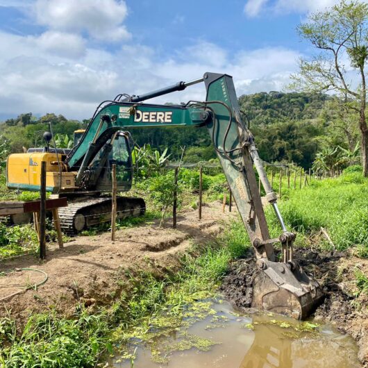 No bairro Perequê Mirim, há uma equipe operando outra retroescavadeira na avenida Yoshiso Shibata. Também no Perequê Mirim, uma máquina PC opera na limpeza da vala na rua Projeta 1.