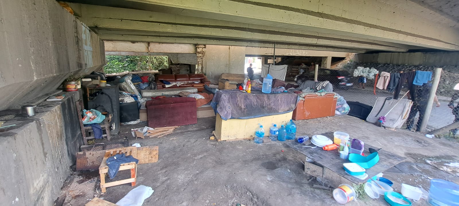 #PraTodosVerem Foto do vão da Ponte do Porto Novo. Há colchões, pratos, panelas, lençóis, recipientes plásticos, galões de água e caixotes de pessoas em situação de rua que ocuparam o local.