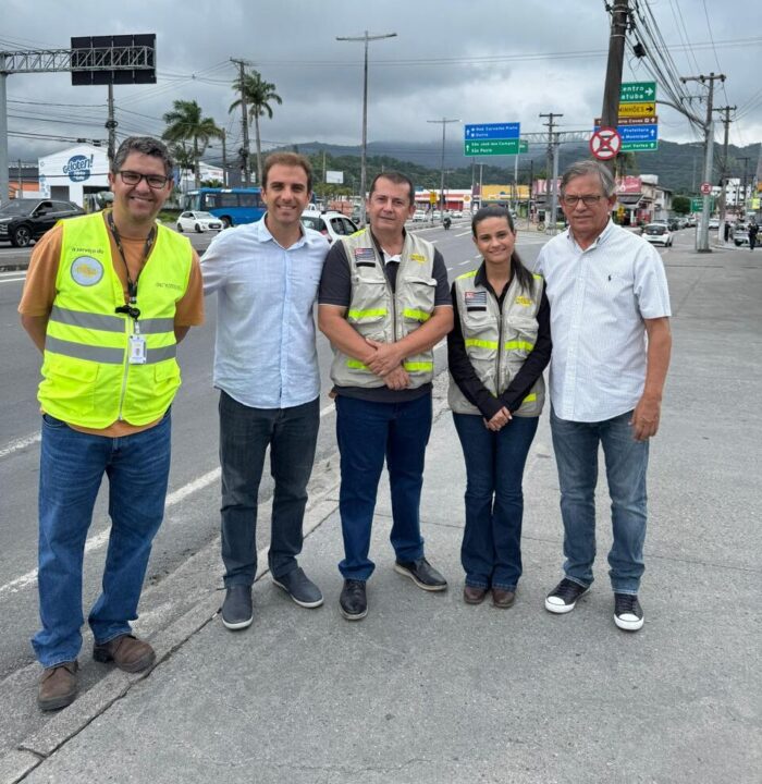 #PraTodosVerem: Prefeito Mateus Silva e secretário de Obras Públicas, Gilson Mendes, ano lados dos técnicos e técnica do DER-SP durante vistoria em trecho do principal trevo de acesso a Caraguatatuba, em Janeiro (Fernando Matos/PMC)
