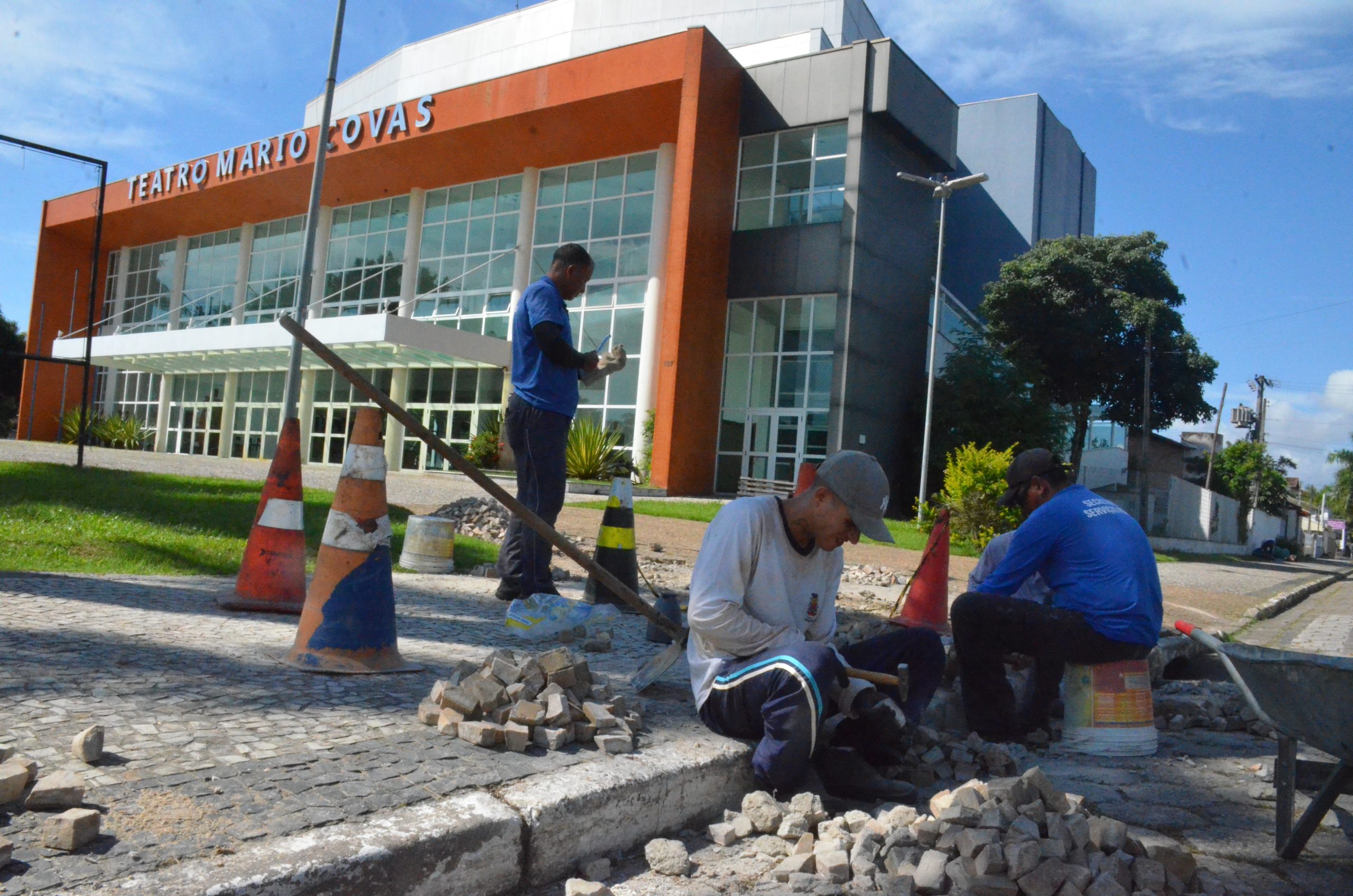 Funcionários da Secretaria de Serviços Públicos do governo municipal de Caraguatatuba recolocam as pedras portuguesas nos trechos esburacados da praça em frente ao teatro.