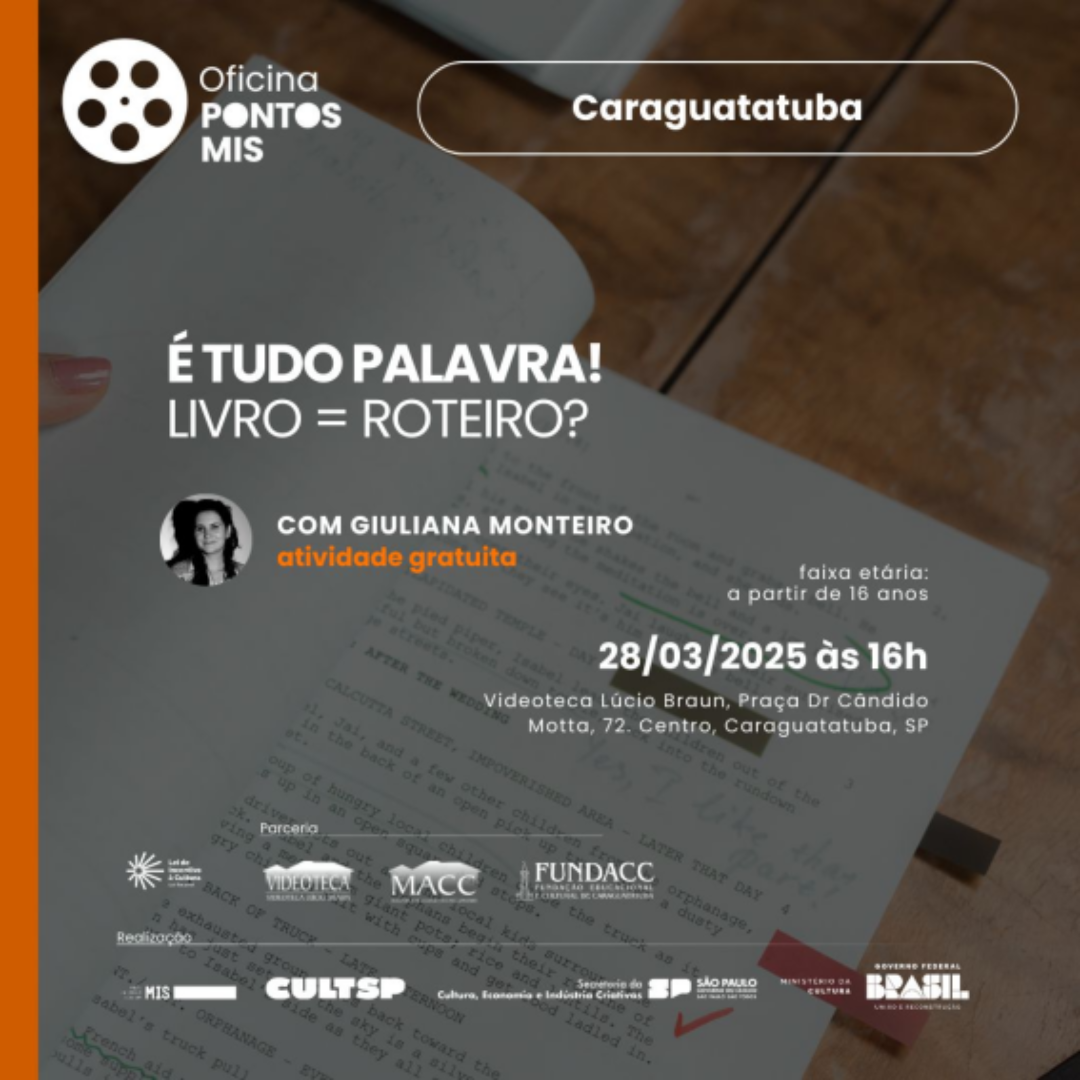 A Videoteca Lúcio Braun, em Caraguatatuba, recebe nesta sexta-feira (28/3), às 16h, a oficina do Pontos MIS “É tudo palavra! Livro = Roteiro?”, ministrada por Giuliana Monteiro. As vagas são limitadas e a inscrição deve ser realizada por meio do formulário https://tinyurl.com/yck3kv4w. Classificação 16 anos.