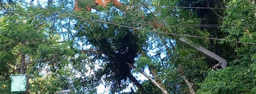 #PraTodosVerem Dois funcionários em cestos aéreos retiram galhos de árvores presos em fiação. Embaixo, servidores da Sesep e Defesa Civil orientam a ação.