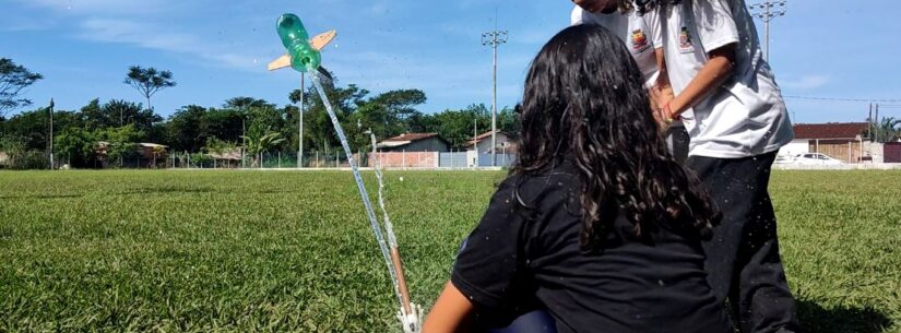 #PraTodosVerem – Alunos soltam ‘foguetes’ de garrafa PET no Campo do Jetuba (Foto: Hugo Labanca/PMC)