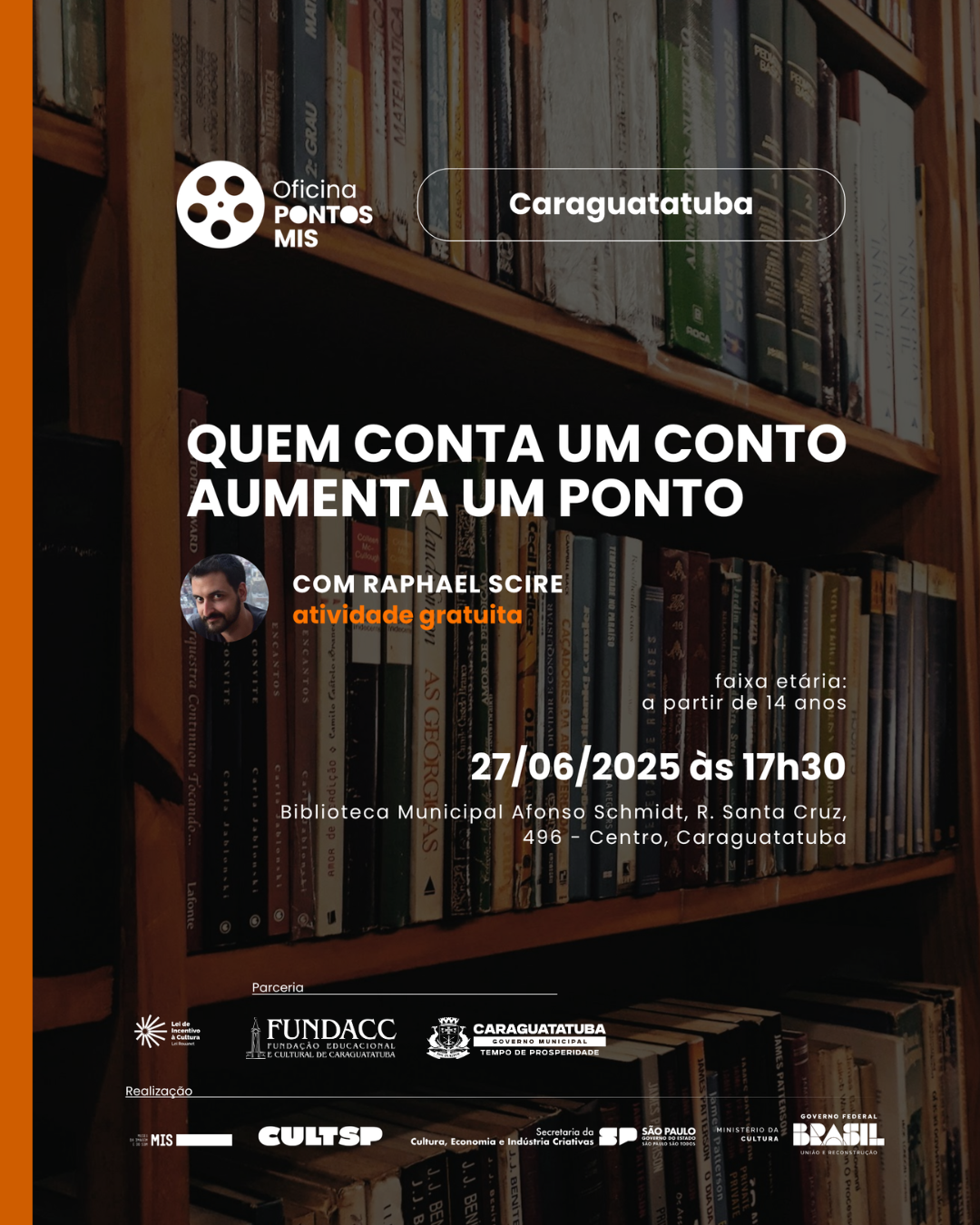 O Pontos MIS (programa do Museu da Imagem e do Som) em parceria com a Fundação Educacional e Cultural de Caraguatatuba (Fundacc), promove no dia 27/6 (sexta-feira), às 17h30, na Biblioteca Municipal Afonso Schmidt, a oficina “Quem conta um conto aumenta um ponto”, com Raphael Scire. As vagas são limitadas e a inscrição deve ser realizada pelo formulário: https://tinyurl.com/mrztyr2b