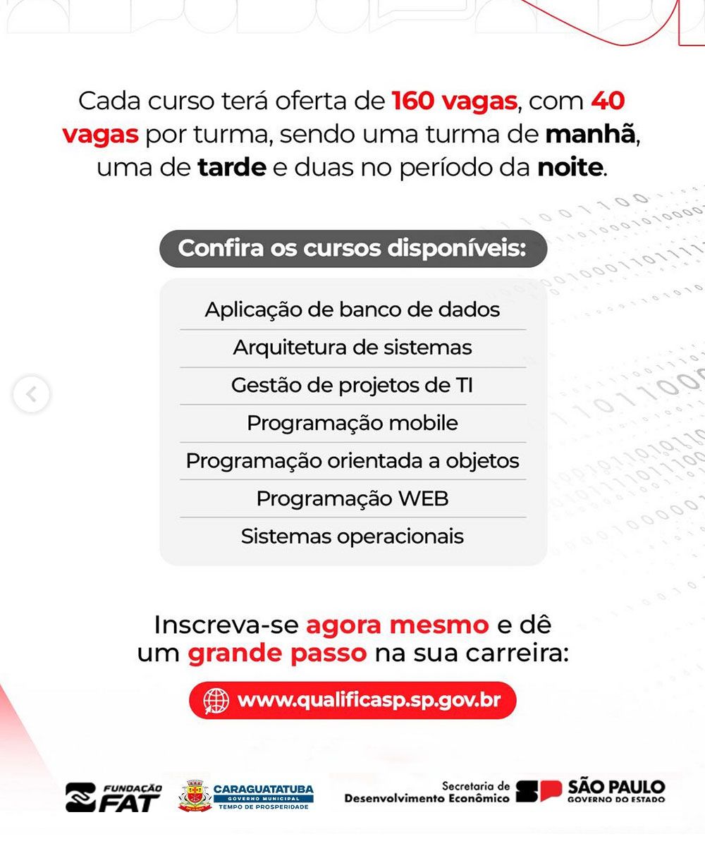 Jovens de Caraguatatuba têm a oportunidade de se qualificar em cursos na área de Tecnologia da Informação de forma gratuita. A iniciativa é do programa Qualifica SP – Novo Emprego, do Governo do Estado, com inscrições abertas até o dia 15 de junho, por meio do site https://l.ead.me/QualificaSP.