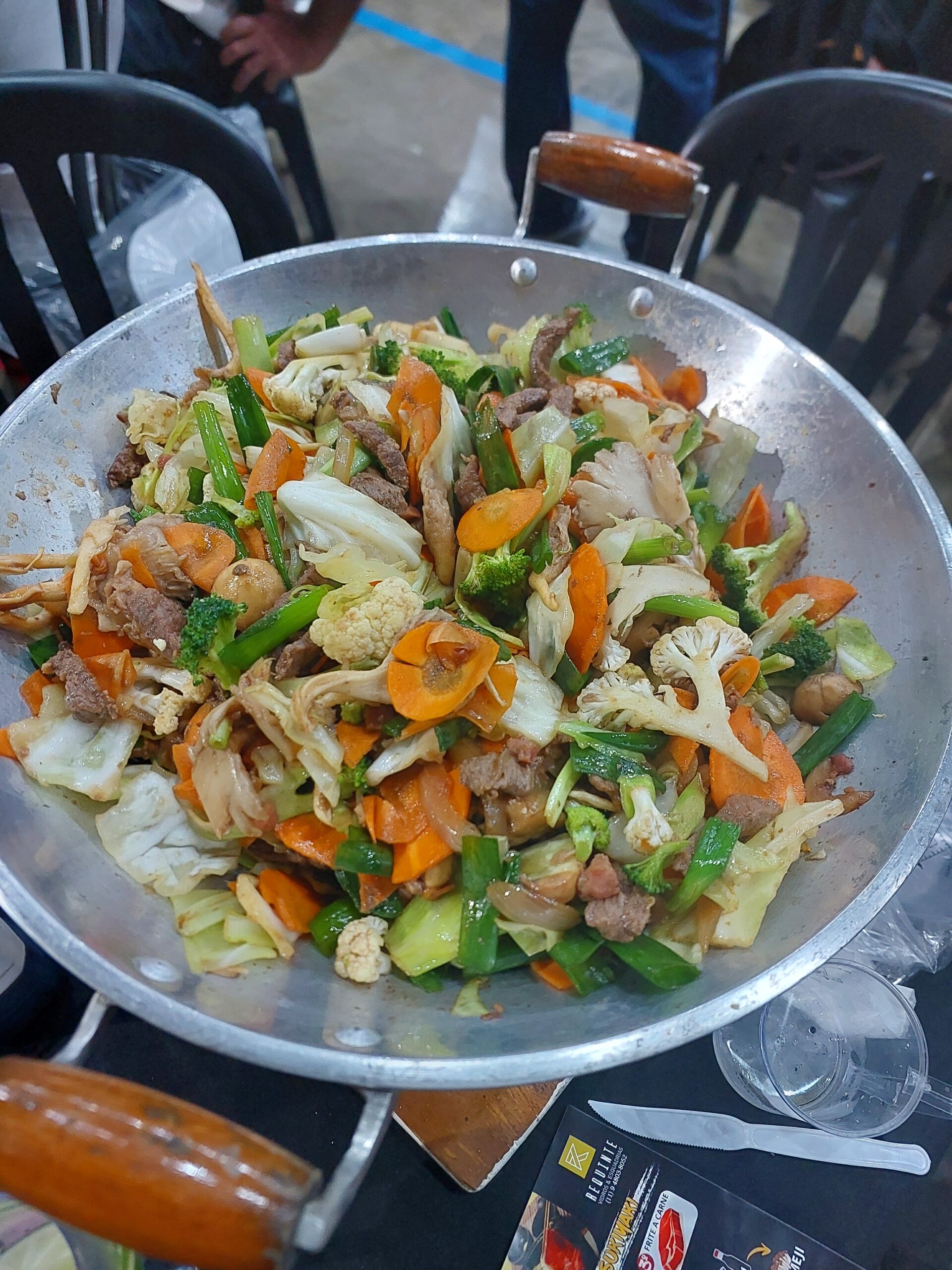 Confira estas dicas que são as mesmas de quem prepara na festa. Primeiro, derrete a manteiga, depois frita o bacon e a carne. Na sequência, acrescenta cebola, cogumelo, 1/4 de shoyu, shimeji, cenoura, brócolis e couve-flor, repolho, cebolinha, novamente 1/4 de shoyu, acelga, agrião, broto de feijão, pasta de peixe e mais shoyu.
