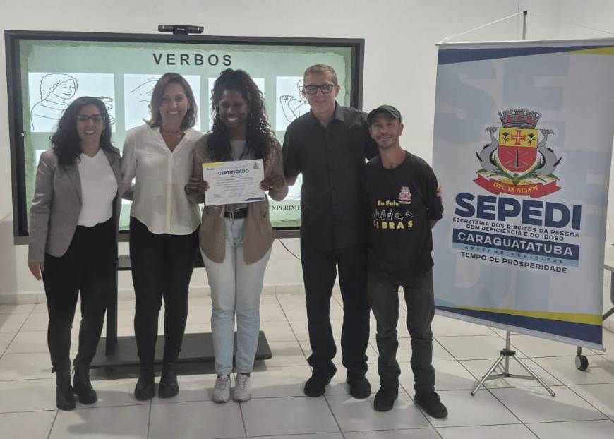 #PraTodosVerem Da esquerda para a direita, a secretária adjunta da Sepedi, Fernanda Ramiro, a secretária, Ivy Malerba, a aluna Daniele de Jesus, que segura o certificado de conclusão do curso, e o instrutor Alan Miranda, e Silvio, da comunidade surda de Caraguatatuba.
