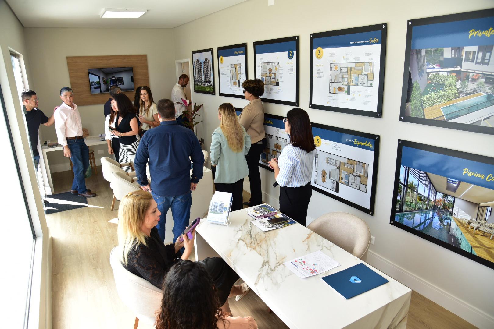 Durante a programação, os presentes puderam visitar o apartamento decorado, assinado pelas arquitetas Carla Fernandes e Sara Mendes. O projeto traduz o perfil do novo consumidor de imóveis no litoral, com ambientes que equilibram funcionalidade, conforto e estética contemporânea.