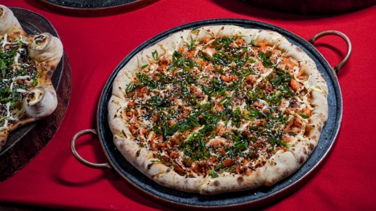 Pizza de salmão grelhado coberta com cream cheese, tarê e cebolete com borda de cream cheese salpicada com gergelim.