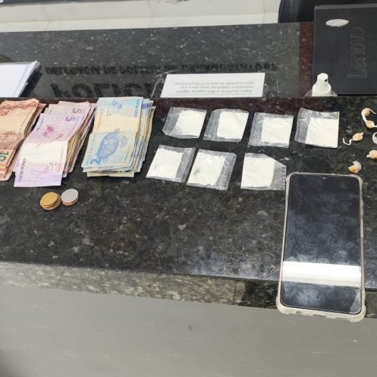 Os agentes avistaram os dois homens e uma mulher em atitude suspeita na Avenida José Benedito de Faria. Na abordagem, foram encontradas 15 porções de crack, sete porções de cocaína e R$ 591,65 em notas trocadas com um dos suspeitos. O segundo homem teve os dados consultados e confirmado pelo Centro de Operações Integradas (COI) um mandado de prisão civil em aberto. A mulher foi liberada após verificação.