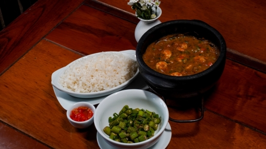 Prato Principal: Gumbo de Camarão – cozido típico da culinária crioula de Louisiana – U.S.A – camarão rosa, temperos cajun, salsão, alho poró, pimentão vermelho e tomate, acompanha quiabo frito e arroz.