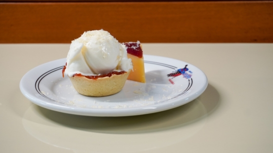 Massa Sablée recheada com goiabada cremosa, uma bola de sorvete de queijo parmesão, finalizado com parmesão ralado.