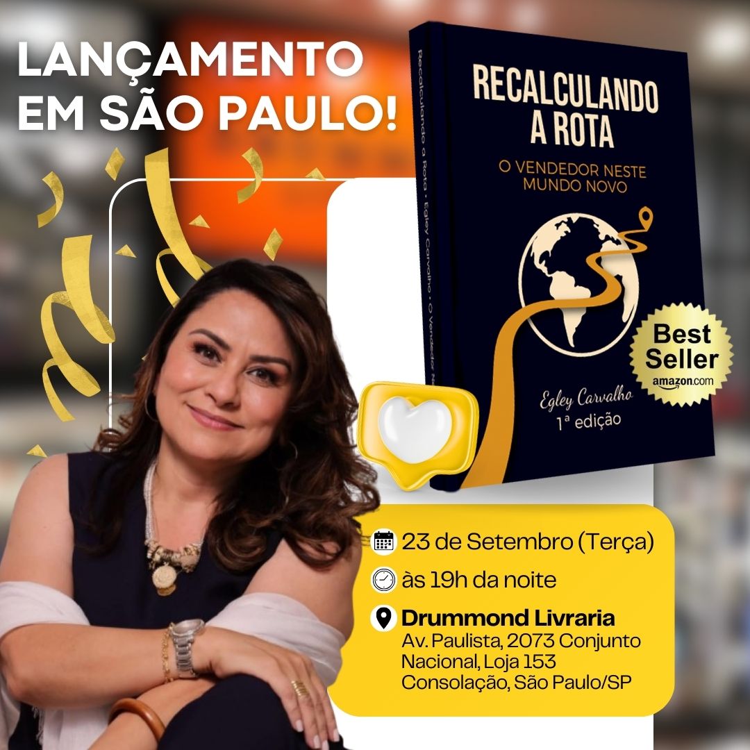 Com mais de 20 anos de experiência nos setores varejista, atacadista e distribuidor, a empresária, palestrante e mentora de negócios Egley Carvalho lança a versão física do best-seller da Amazon Kindle, ‘Recalculando a Rota: o vendedor neste mundo novo’. O evento ocorre no próximo dia 23 de setembro (terça-feira), às 19h, na Livraria Drummond, na Avenida Paulista, em São Paulo, e contará com a venda de exemplares e autógrafos.