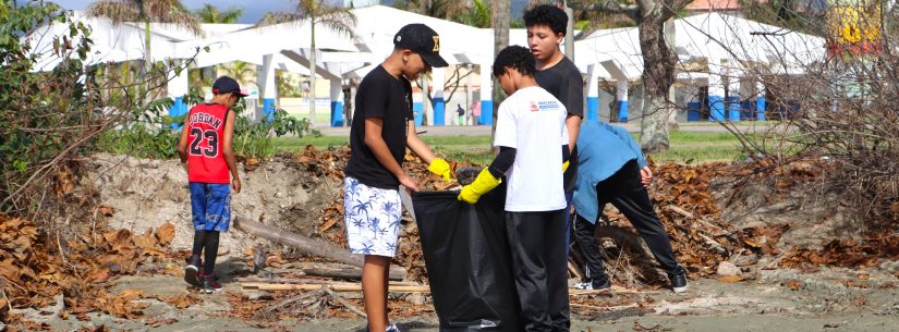 #PraTodosVerem – Multirão de limpeza na Praia do Porto Novo, em Caraguatatuba, com voluntários e adolescentes.