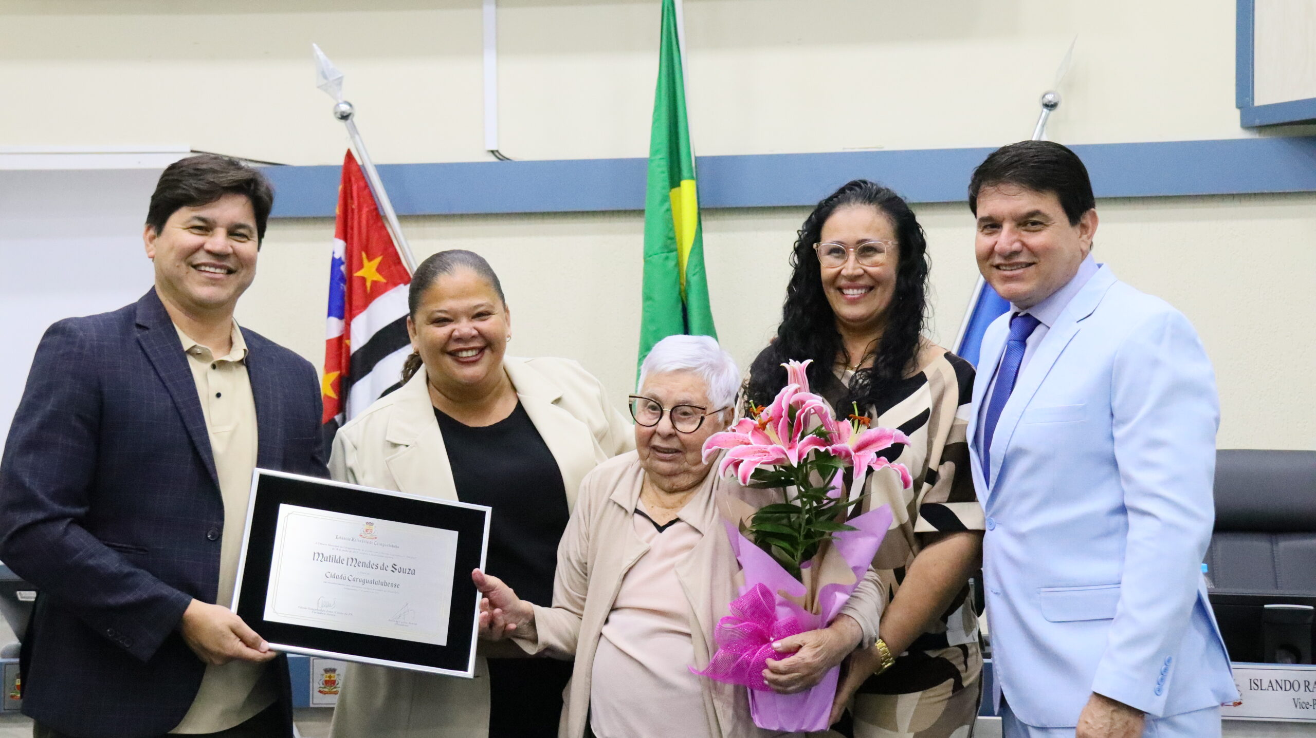Em noite marcada por emoção, a senhora Matilde Mendes de Souza, de 99 anos, foi homenageada nesta quarta-feira (17/09), pela Câmara Municipal de Caraguatatuba durante Sessão Solene de entrega do Título de Cidadã Caraguatatubense, em reconhecimento aos relevantes serviços prestados ao município. A homenagem foi proposta pela vereadora Cássia Gonçalves de Jesus (Cássia do PT).