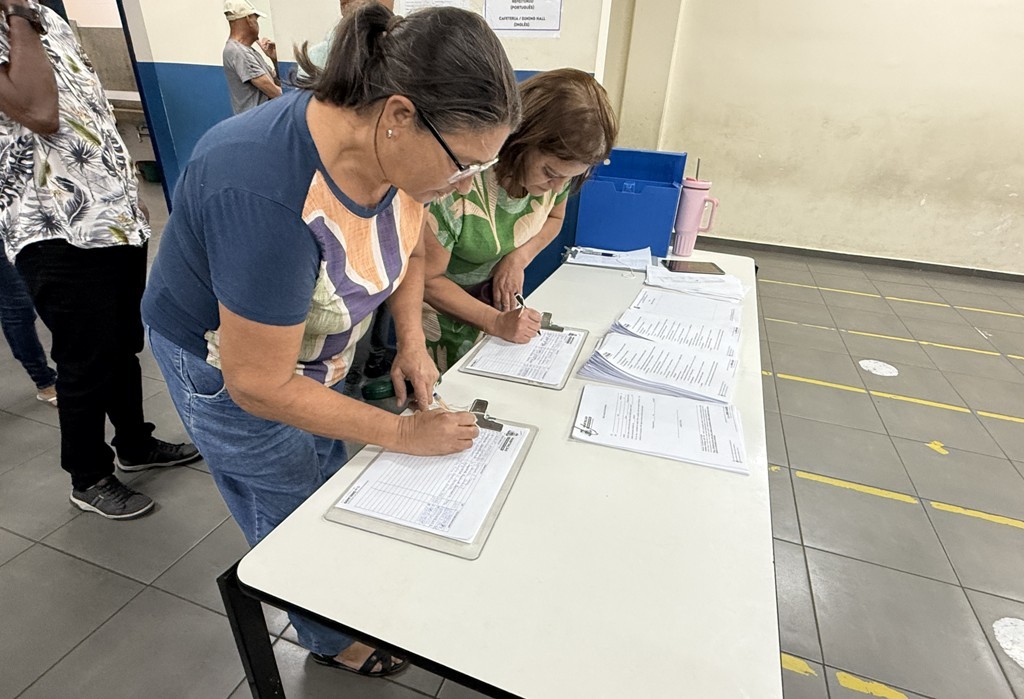 #PraTodosVerem: Duas moradoras assinam lista de presentes na reunião da Secretaria de Habitação de Caraguatatuba sobre o processo de regularização fundiária do Núcleo Paulino Ferreira na última terça-feira (7/10), na Emef Profª Jane Urbano Focesi, no Perequê-Mirim (Foto: Dony Machado/PMC)