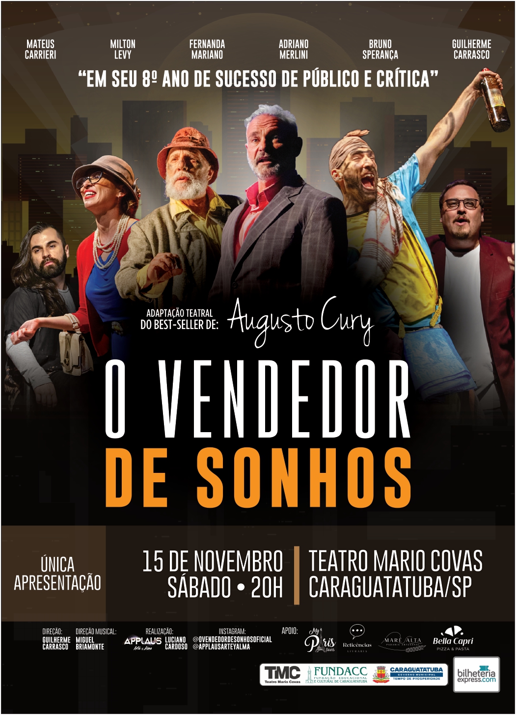 Neste sábado (15/11), às 20h, o Teatro Mario Covas apresenta o espetáculo ‘O Vendedor de Sonhos’, adaptado do livro best-seller do psiquiatra, professor e escritor brasileiro Augusto Cury. Os ingressos custam entre R$ 50 e R$ 120 e podem ser adquiridos antecipadamente pelo link https://tinyurl.com/68epy3mc ou na livraria Reticências, na Rua Padre Anchieta, nº 556, no Centro de Caraguatatuba.