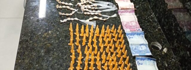 Durante patrulhamento, os agentes observaram que o suspeito tentou se afastar ao notar a aproximação, entretanto foi abordado. Na revista pessoal, foram encontradas 100 porções de cocaína, 99 porções de crack, além de uma quantia em dinheiro.
