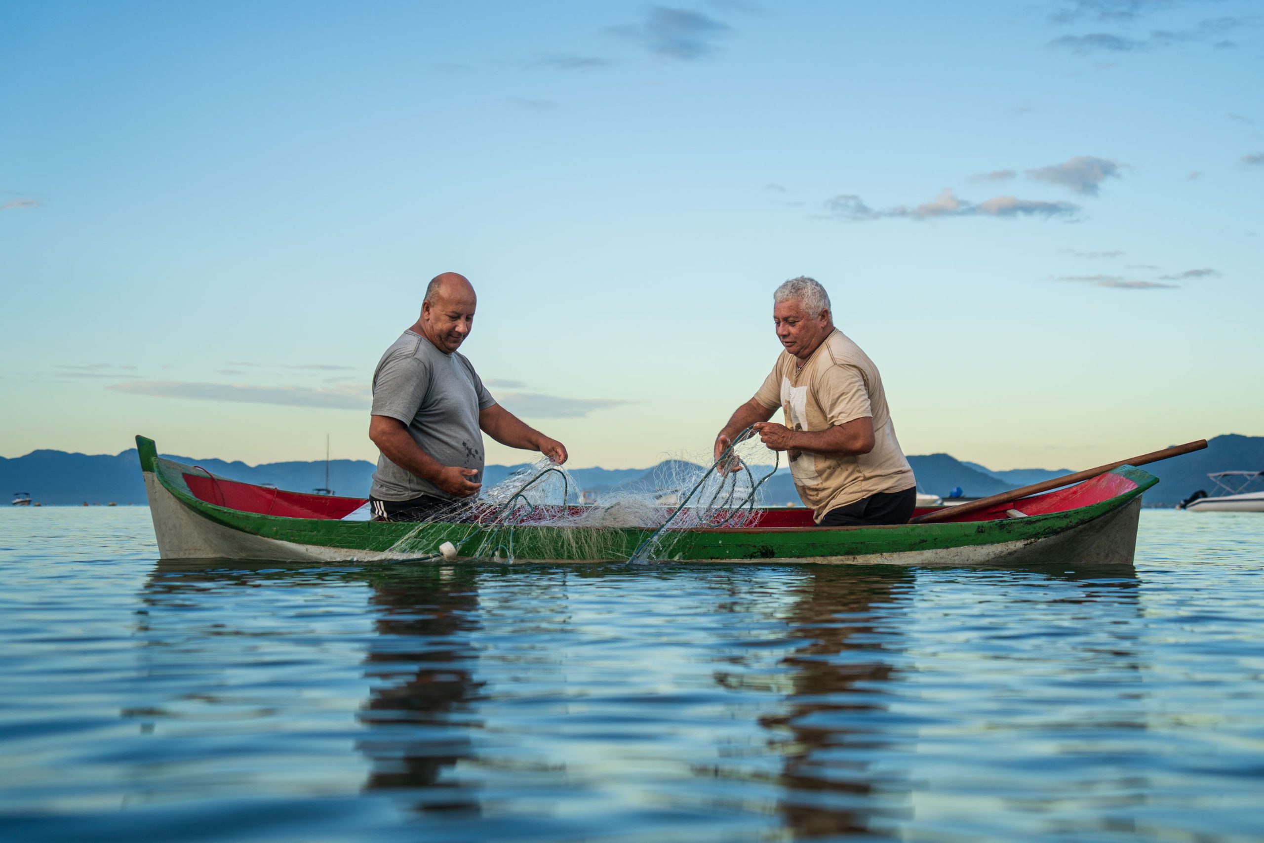 #PraTodosVerem – Dois pescadores em um barco no mar mexendo em uma rede. (Foto: Hugo Labanca/PMC)