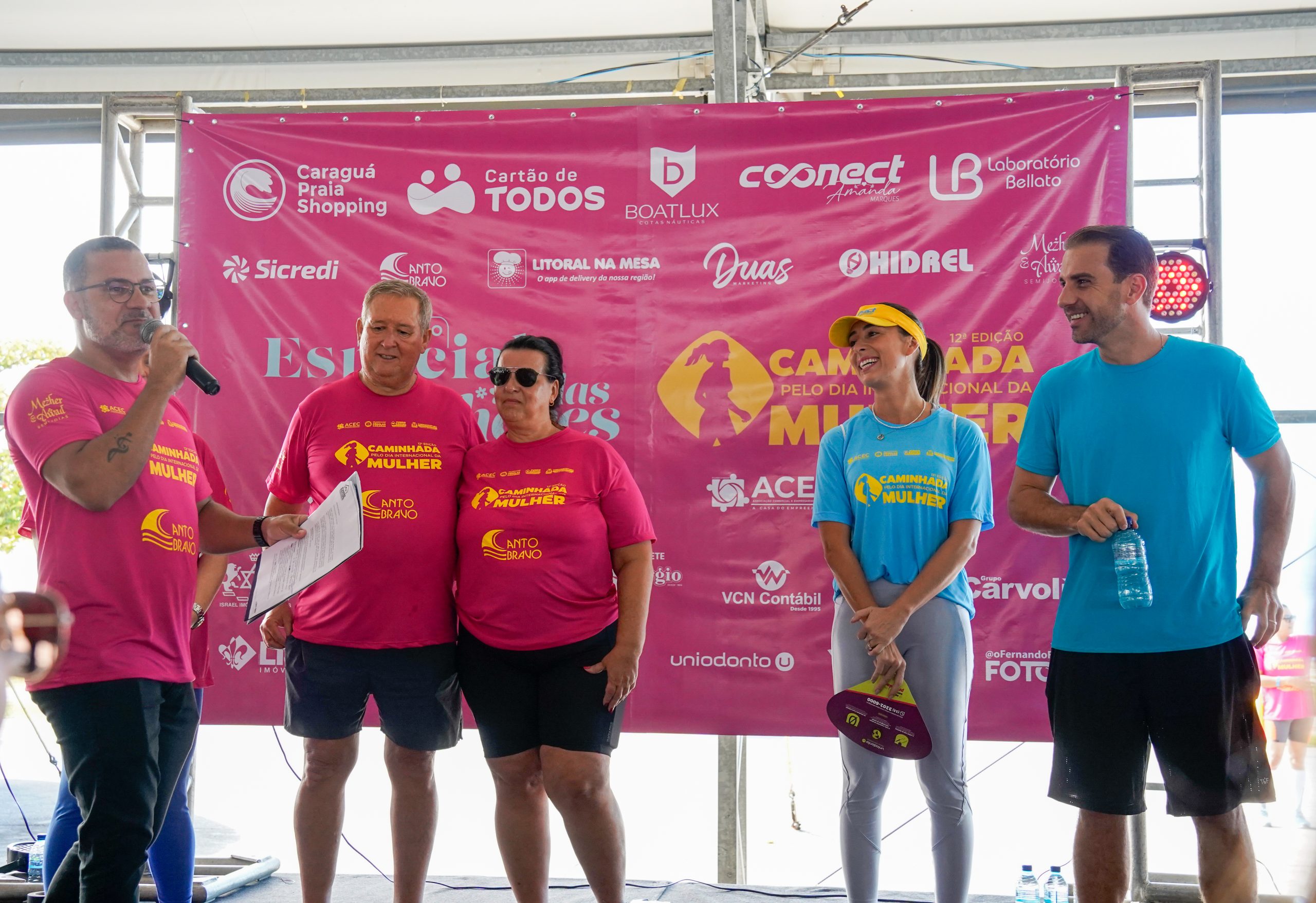 #PraTodosVerem O locutor do evento ao microfone, ao seu lado, da esquerda para a direita, o presidente da Associação Comercial e Empresarial de Caraguatatuba, Ari Barbosa, sua esposa, Simone Barbosa, a presidente do Fundo Social, Talita Carneiro, e o prefeito Mateus Silva
