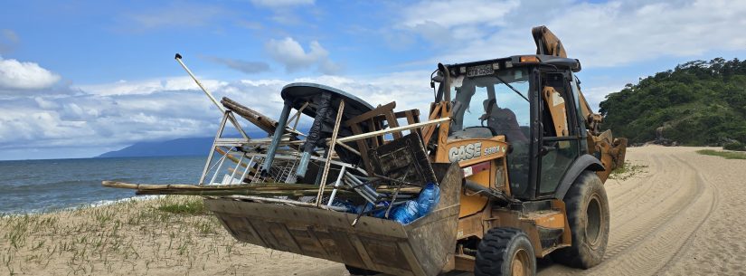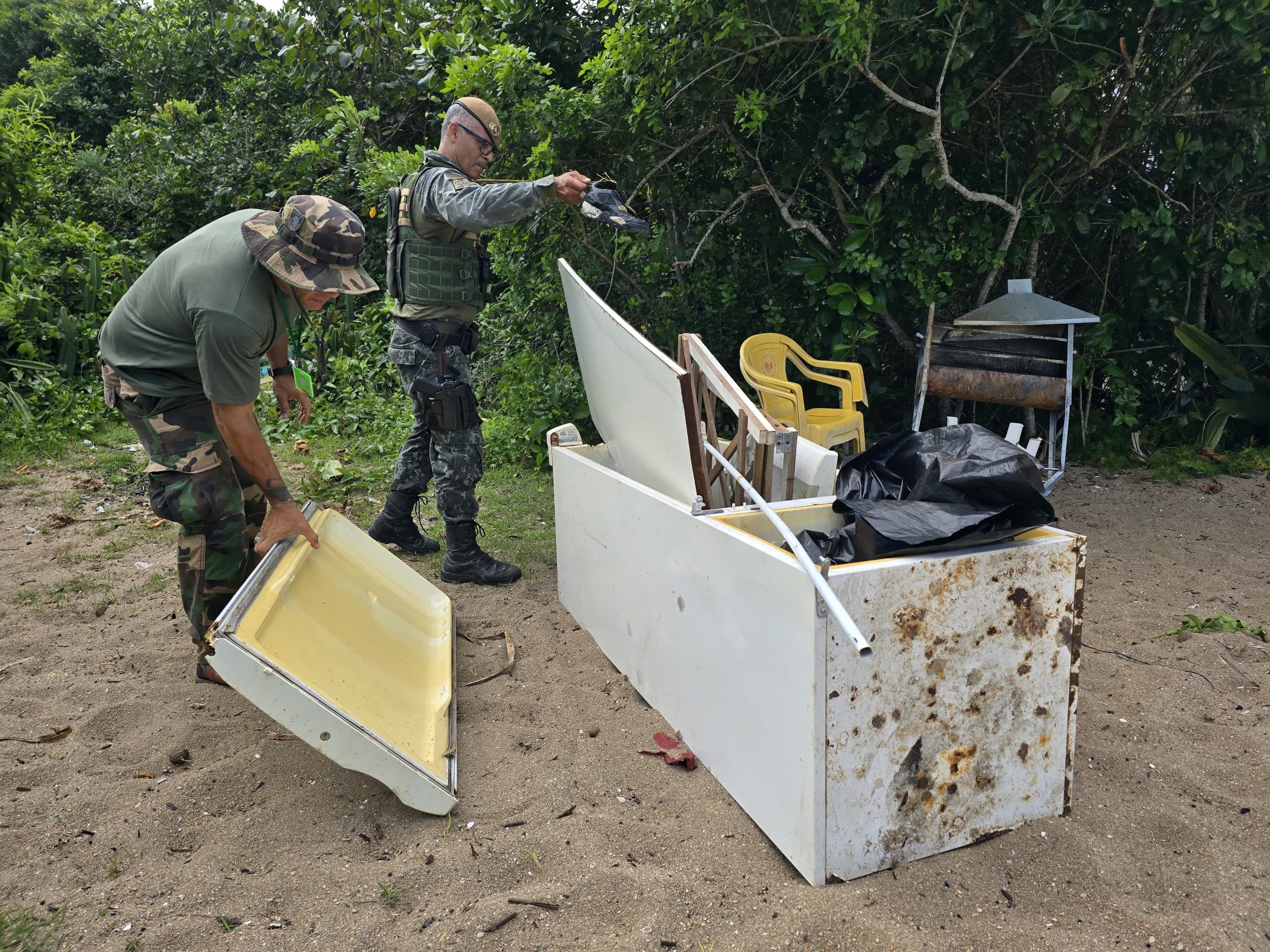 Após denúncia recebida pela Central 156, fiscais ambientais, policiais da 3ª Companhia do 3º Batalhão de Polícia Militar Ambiental e funcionários da Secretaria de Serviços Públicos estiveram na última quinta-feira (5/3), no local, para apreender objetos armazenados por ambulantes clandestinos em vegetação baixa de restinga especial.