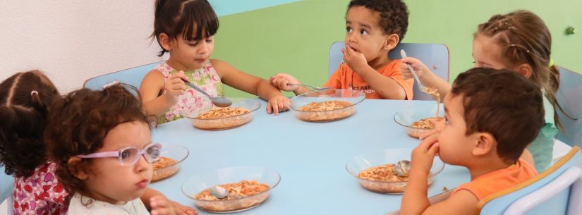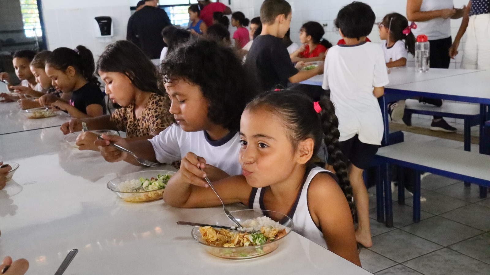 #PraTodosVerem – Crianças sentadas em mesas de um refeitório, durante a refeição. Uma menina come um prato com arroz, salada e macarrão. Ao lado, outras crianças também se alimentam (Foto: Fernando Matos/Seduc)
